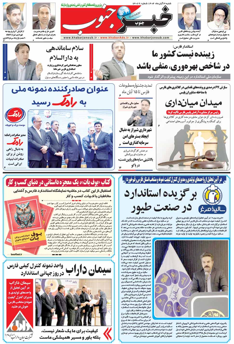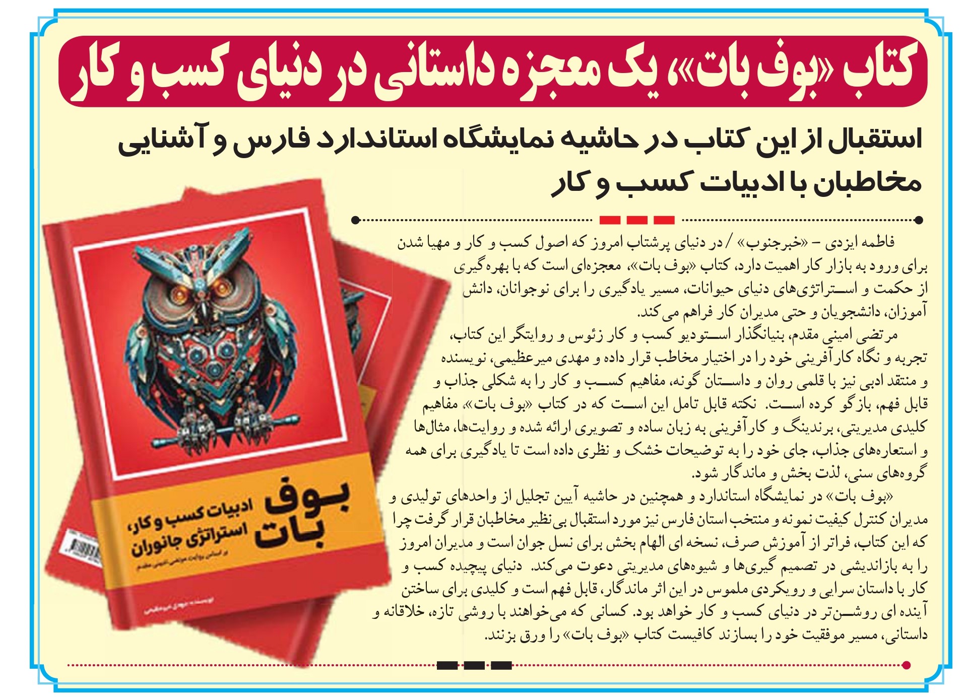 روزنامه «خبر جنوب» در شماره امروز خود با انتشار گزارشی به کتاب «بوف‌بات» پرداخته و از آن به‌عنوان «معجزه‌ای داستانی در دنیای کسب‌وکار» یاد کرده است.